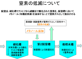 脱窒法とは,窒素成分を活性汚泥中の微生物の働きによりアンモニアから硝酸態窒素まで酸化させた後,有機物を添加することで硝酸態窒素を窒素ガス(N2)として大気中に放出させる方法です。この脱窒法を効率的に行うためには微生物(脱窒菌)を活発に働かさなければなりません。この菌は有機物や炭素などのエネルギー源が多くさらに酸素がない状態でないと硝酸態窒素を窒素ガスにしてくれません。消化液は,メタン発酵により有機物や炭素が消費されていることから脱窒菌が必要とするエネルギーが足りません。そこで,有機物源としてメタノール(有機炭素源)を使用しました。
