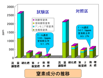 その結果を処理水中の全窒素(T−N)の推移として図4に示しました。対照区では,567.9ppmで除去率80.2%でしたが,メタノール添加した試験区では,処理水中T−Nが108.3ppm,除去率95.8%とメタノールを添加しなかった対照区に比較して高い除去効果が認められました。