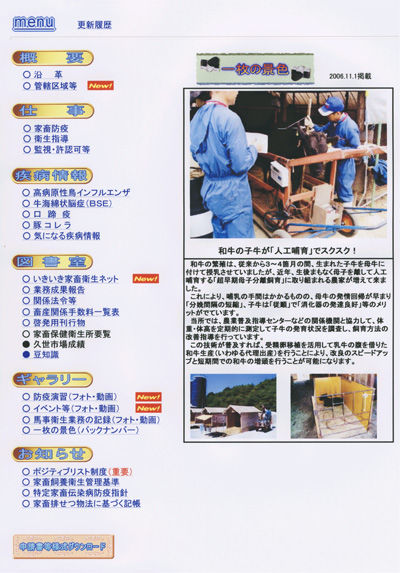図2の第2の画面右半分のこのコーナーは,家保の日常活動の一コマを紹介するものです。家畜保健衛生所の業務を中心に,日頃の活動,知られていない1面,今頃やっていること,大切に考えている取組,などを写真で紹介します。10日間隔で更新しますのでお見逃しなく。