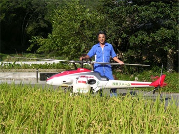 この人は,水稲等の各種作業を広く受託し,農家からは“頼りになる助っ人”と言われている浅野和敏氏。この日は無人ヘリで水稲の出穂前防除作業をしていたのでした。