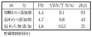 今回調製したサイレージの発酵品質は,表2のとおりフリーク評点25〜93点で,切断わらに乳酸菌を添加したものが最も良好でした。VBN/T−N(全窒素のうち主としてアンモニア態窒素の割合で低いほど良質発酵といえる指標)は9.1〜10.2%で全体的に良好でした。