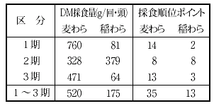 1〜3期通算の平均DM採食量(g/回・頭)は麦わらサイレージが520g,乾燥稲わらが175gで麦わらサイレージが乾燥稲わらより多くなりました。また,採食順位ポイントも12頭トータルで35対13で麦わらサイレージが高くなりました。ただし2期目ではDM採食量も採食順位ポイントも同じ程度になりました。これは,麦わらサイレージを開封しカッターで細断後ビニール袋に貯蔵し供試したため,2期目に入った時点で二次発酵がおこりサイレージが劣化したたものと考えられました。そこで3期目は新たにサイレージを開封し供試したので,DM摂取量も,採食順位ポイントも1期と同様な傾向を示しました。