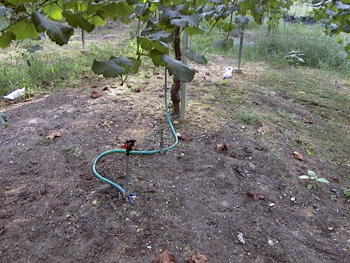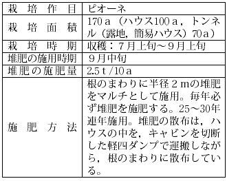 ブドウの根のまわりに,半径2mの堆肥をマルチのように表面施用します。また,活力のある細根を増やし樹を元気に保つために,毎年,堆肥等を,50〜70p掘って,部分深耕で投入されています。毎年必ず堆肥を施用しており,25〜30年にわたり連年施用されています。