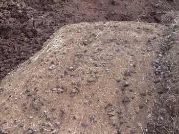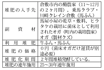 津郷さんが使われる堆肥は牛ふんと馬ふんを原料にして作られます。原料となる牛ふんは酪農家からもちこまれます。また,馬ふんは,川崎乗馬クラブ・クレイン倉敷から月に3回ほど,1回につき2トン車で運び込まれています。窒素の少ない堆肥を必要とするため,堆肥の窒素含有量を減少を目的に,ヒラタケのオガ・菌床を副資材として利用されています。ショベルカーによる2ヶ月おきに切り返ししながら,自分の求める堆肥を作られています。堆積期間は2年で,よく腐熟した堆肥を,有機物として年間10a当たり2.5tほど農園に広げています。