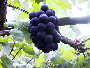 ピオーネの10aあたりの収穫量は1,500sになります。10a当たりの収穫量を1,500sに厳守することで,色づきが良く,糖度も17度以上のブドウに仕上げられています。ピオーネは見た目がとても大事なので,一粒16gの大玉生産に励んでおられます。出荷は,農協を通じて販売され,市場や地元のデパートで高い評価を受けておられます。
