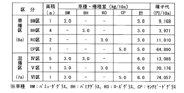 @ 発芽:播種後に適度に降雨があり,鎮圧が十分な場所は発芽が良好でした。発芽は草種による差が大きく,RO と BM は良かったものの,BH