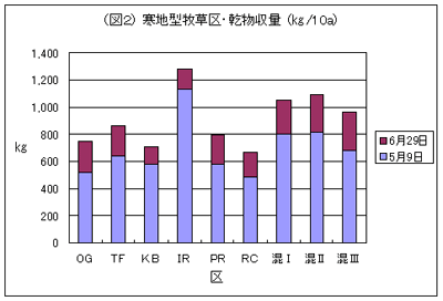 B 収量:収穫調査結果は(図2)のとおりで,1番草では IR が最も多く,次いで混播各区が多く,OG と KB が少なくなりました。2番草ではクローバーの入った混播各区が最も多く,次いで OG,TFが多く,KB と IR は少なくなりました。