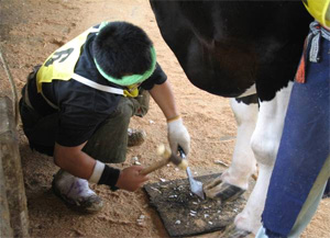 日本装蹄師会の服部課長を審査員長に向かえ削蹄状態を審査するため1肢づつ持ち上げ負面(蹄の裏側で床と接する面)について詳細な審査が行われました。