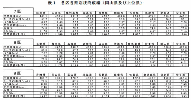 岡山県出品牛8頭の成績は,各区において肉質肉量とも安定した成績で,特に岡山和牛と平茂勝号の交配によって作出された花茂勝2号及び勝福茂号の産肉能力は肉質肉量とも全国トップクラスの種雄牛です。また,この2種雄牛の出品区である7・9区の平均枝肉価格は宮崎・岐阜に次ぐものであり,岡山和牛の産肉能力は,肉質肉量ともに今や全国トップレベルとなっていることが推察できる結果でした。