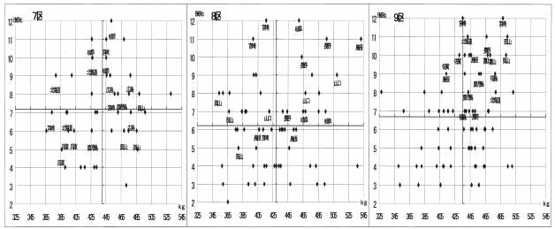 この区は種牛性と産肉性とを総合して競う区であり,全国14道県が出品していました。全体平均は,枝肉重量440.2s,ロース芯面積53.1p2,バラ厚7.28p,脂肪交雑(BMSNo)7.19,枝肉価格986千円でした。