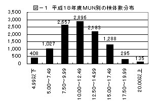 MUN別の検体数分布を図−1に示した。MUNの県内総平均は11.25r/qで10.00〜12.49r/qを中心にほぼ正規分布が見られ,7.50〜14.99r/qの範囲ものが66.4%となっております。