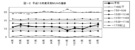 月別・区分MUNの平均推移を図−2に示した。月平均MUNは,5月から10月にかけて低下傾向が見られ,11月には急激に9.12r/qと大きく低下が見られ,12月から3月にかけてややスムーズさに欠けるものの上昇しています。
