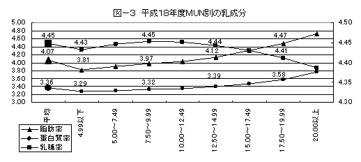 MUNに対する乳成分の推移を図−3に示した。脂肪率については年平均4.07%で,MUN4.99r/q以下の3.81%から徐々に上昇し,15.00r/q以上は大きな上昇が見られます。蛋白質率は年平均3.36%で,脂肪率と同様な傾向が見られています。乳糖率については,年平均4.45%でMUN4.99以下は4.43%,7.50から12.49r/qは4.45%,12.50r/q以上は低下傾向が見られています。