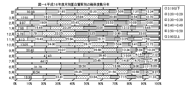 蛋白質率に対する月別検体数の度数分布を図−4に示した。蛋白質率3.19%以下は,4月18.99%から5月には30.54%と急激に増加し,7月は44.15%となり8月に最高の47.43%に増加しています。9月には20.40%と急激に減少し,以後も減少して12月に最低の5.78%となり,1月から増加し3月は12.81%で,年平均20.99%です。