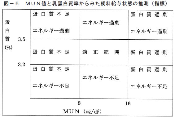 生乳中のMUN値を知ることにより飼料給与管理等の一助になればと思っております。飼料中の蛋白質が過剰や,蛋白質に対してエネルギーが不足しているとMUNは高く,この反対ではMUNが低下します。しかし,MUNは乳期及び乳量・分娩回数・遺伝的形質・飼養環境等により変動するため,MUNの適正値は,地域により異なり基準値として認定されたものではなく,MUN検査値単独での評価は誤った結果となります。