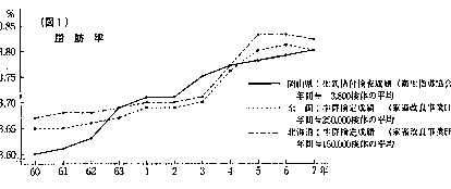 岡山県で生産される生乳の格付検査は,S60年から岡山県家畜畜産物衛生指導協会で実施していることはご承知のことであります。 (1) 脂肪率。岡山県ではS60年に3.60%であったものが毎年順調に推移しH7年には3.80%に上昇している。これを全国平均・北海道平均と比較してみますと,S62年までは全国・北海道に劣っていましたが,以後順調に上昇しH7年度は県内産生乳は全国平均並になっています。