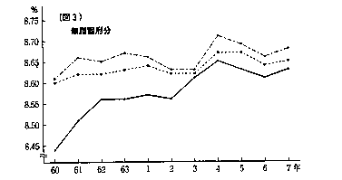 (1) 脂肪率。岡山県ではS60年に3.60%であったものが毎年順調に推移しH7年には3.80%に上昇している。これを全国平均・北海道平均と比較してみますと,S62年までは全国・北海道に劣っていましたが,以後順調に上昇しH7年度は県内産生乳は全国平均並になっています。 以上の結果で結論を出すことはできませんが,岡山県産生乳は全国平均又はそれ以上の高品質乳になってきた事が伺えます。