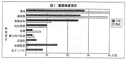 図1に「現在実施している検査項目のうち,各メーカーの原乳担当者が重要と思う項目」,さらに「今後重要となってくると思う項目」についての回答を示しています。これによると,現在は風味と細菌数が検査のポイントになっています。また,体細胞数や無脂固形が,今後の重要とする検査で大きく増加しているのが目立ちます。これは,風味の素となるものに重点を置いていこうという姿勢ともいえます。