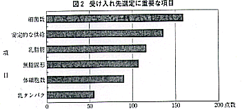 図2に,「地域以外からの生乳受け入れ先の選定に重要な要素は?」という質問に対する回答内訳を示しました。細菌数,安定的な供給,乳脂肪,無脂固形の順に選定条件として重要ともいう結果がでています。安定的な供給は当然としても,細菌数がここでもあがっていることから,「クリーンな牛乳」が求められていることがよくわかります。