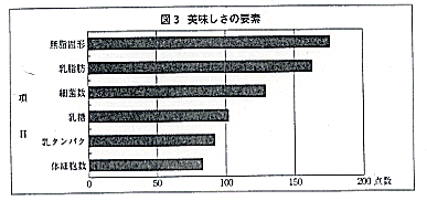 「美味しさを左右する要素として重要な乳成分は?」との問いの回答を図3に示しました。牛乳の甘味は乳糖(一部乳脂肪),口当たりとコクは乳脂肪と乳蛋白質等が関係するので,乳脂肪と無脂固形(美味しさは感覚的には無脂固形に左右されるところが大きいと言われています)が大切だと思われています。一般に乳成分は高ければ高い程良いと思われがちですが,乳脂肪と無脂固形との量的比率がポイントです。