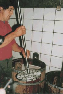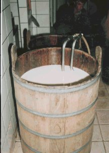 樽が古くなってこれを更新する際には,チーズ製造中にできるホエーで,3カ月程度洗浄し使用するそうです。これにより,乳酸菌が樽に住みつくようになるという訳です。
