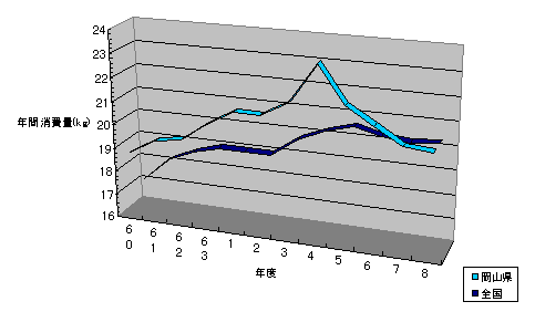岡山県の1人当たりの鶏卵消費量は,全国平均を上回って推移し,平成元年及び2年の時点では約2sの差があった。しかし,平成7年以降は,0.2sの差に縮まりほぼ全国並の消費量になっている。消費量の推移には昭和63年と平成5年に2つの山が見られるが,これは卵価の低迷した年と一致し,量販店の特売に卵の利用が目立った時期と重なっている。平成8年の岡山県の消費量は,20.5sでそのうち家計消費は10.9s,業務加工用は9.6sであり,消費量を根拠にした県全体の年間需要量は39,901トンと推定される。(図2)