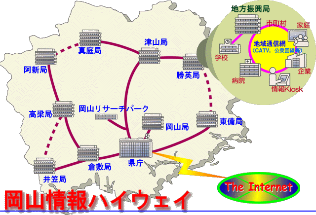 こうしたことから,県自らがネットワークを整備する一方,民間のネットワークと相互接続を図りながら,県内全域をカバーする高速な情報通信網(岡山情報ハイウェイ)を整備し,県民に広く開放することで「快適で活力あふれる岡山」を実現しようとしているのです。