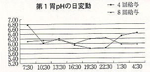 これは,夜間は空腹状態にあり,ルーメンの活動が低下し,反面昼間は濃厚飼料多給状態になっていると考えられます。