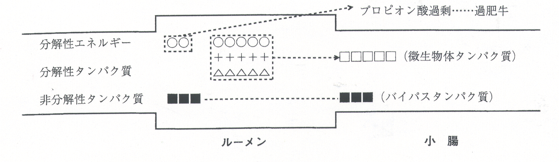 しかし,ルーメン内エネルギーが過剰な場合は,余ったエネルギー(2つの○−デンプンや糖分)がルーメン内のプロピオン酪農度を高め,過肥牛を生み出すこととなります。