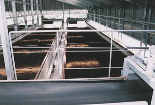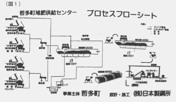 堆肥供給センターの処理方式は,「スクープ式撹拌強制発酵方式」を採用している。そのフローは,(図1)のとおりである。原料は,各農場,畜種毎に指定された貯留槽に投入し,混合し発酵槽へ堆積,順次,養生槽,完熟槽へと移動させ150日を掛けて製品として出荷する計画である。発酵時温度が70℃以上となり,病原菌,害虫卵,雑草種子は,ほとんど死滅する。原料の水分調整は,各農場,農家において65%程度に調整済みの物とし,公道運搬での住民への配慮とセンターでの作業の煩雑さを防ぐため協定している。