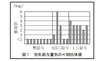 白痢の主な原因菌といわれているK99に対する抗体は,凍結初乳無給与区(自然哺乳区)では当然抗体が認められなかった。0.5リットル給与区では抗体価にばらつきが認められている。1リットル給与区では全頭に2倍以上の抗体価が認められた。