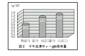 免疫量のバロメーターと云われているγグロブリン量をみると,凍結初乳無給与区(自然哺乳区)では0.9r/qであり有効量といわれている1r/qを僅かに下回っている。0.5リットル給与区は1.38r/q,1リットル給与区は1.56r/qとともに高い数値を示している。
