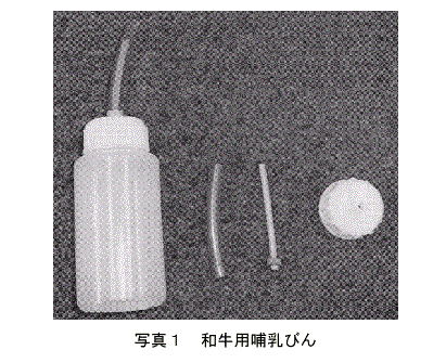 3)哺乳瓶(写真1)は500pの洗浄瓶に耐圧ホースで乳首を作り使用している。この哺乳瓶は,分解が容易で,洗いやすく衛生的である。また,子牛の投薬器としても利用され,安価でできる(500円程度)ことから農家から喜ばれている。