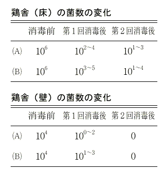 このように消毒は,消毒薬を用いて行うことがほとんどですが,近年消毒により排出される多量の消毒洗浄水が環境問題の原因となってきています。そこで,総合畜産センターでは,その環境対策を踏まえ,残留性及び毒性が無く,広い抗菌スペクトルをもつ,水を弱酸性化したもの(以下「弱酸性水」,有効塩素濃度50〜80ppm,pH4.0〜6.5)を用いて鶏舎における消毒方法を従来の方法(消毒薬:オルソ剤および逆性石鹸)と比較した試験を行っています。下記の表は,(A)弱酸性水を用いて,(B)従来の方法を用いて,鶏舎の床および壁の消毒を行った時の菌数の変化を示しています。また,共に検体1f当たりの細菌数を算出して,それを常用体数に変換して結果を解析しています。