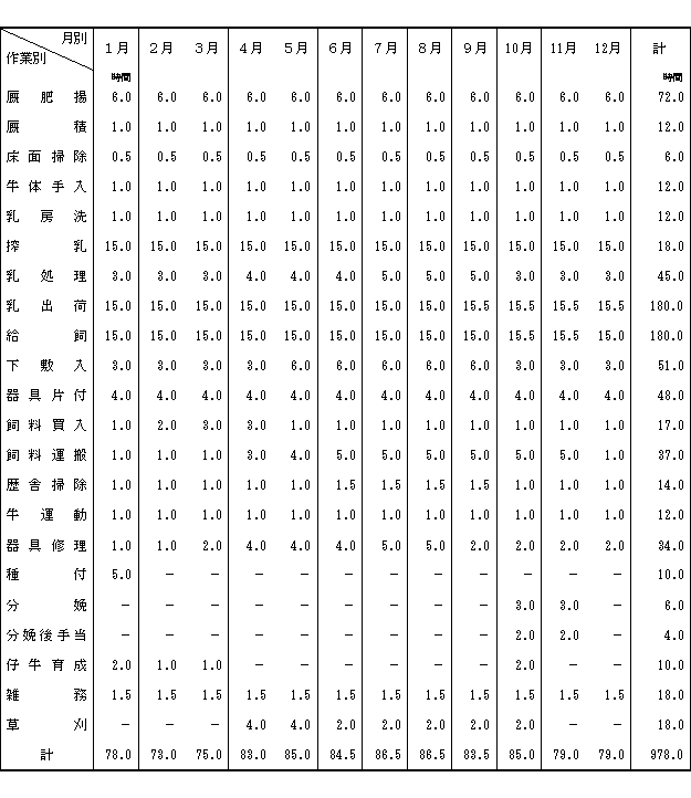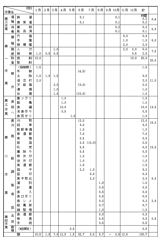 本表は酪農経営研究会に於て児島郡興除村の手島熊次氏の貴重な体験発表である。当日参会者の希望により特に同氏に乞うて本誌に発表させて頂いた。今後の経営合理化に当って労力面の計画的利用を図ることの必要なのは今更説く迄もない。諸賢の御参考になれば幸である。(加本生) 麦作労力早見表(手島氏)