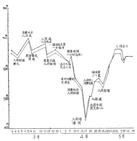 作秋17円,20円とした鶏卵が年末は12円本年2月には10円と急転直下下落の一途を辿り孵卵最盛期に入れば雛祭り花見客と一連の需要期となり値も立直るやに一褸の僥倖を期待していた業者間の憶測もものかは購買力の不振に加えて魚類野菜の安値に押され4月中旬には一挙に大阪着値420円とその底をついた,ここ2―3年間インフレフレームに育まれた戦後派養鶏家の心膽を寒からしめたものも無理からぬことである,……その後5月に入り値も除騰し630―650円台に保合し慚く養鶏家も安堵の生気が甦ってきたが何れにせよこれからの養鶏はその経営方式にも一段と着意を払わねばならないし又変転極まりない卵価の裏に陰に陽に関係をもつ取扱業者の思惑や余りにも零細な集荷組織の濫立に冷厳な批判を加え画一的な組織の統合を計る段階に到達しているといえよう。こころみに産業経済新聞より集録した本春の市況を登載し参考に供したい。(をごう生)
