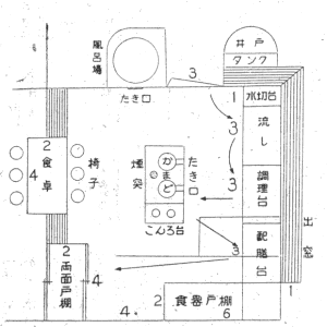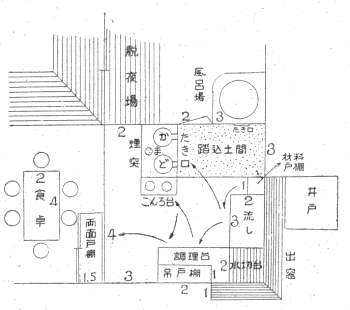 3.かまどの位置が中央にあるのは邪魔になるようであるが整理上都合もよく中央の空間も作らず食事の際,湯茶,こんろと食事が接近して都合がよい