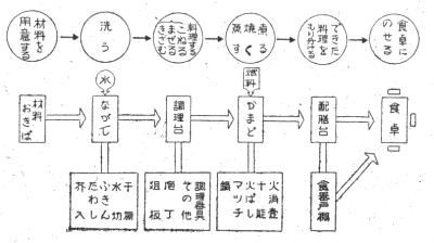 材料を用意してから食卓にならべるまで,炊事の作業は大体きまった順序で行われるからその手順があと先きになったり無駄な動作をしないように流しやかまどを配列し,器具るいも,それぞれの場所にきちんとする。