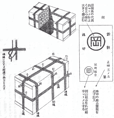 (イ)箱は松材がよろしい。正3分板で継目の少ないもの。又継目から籾殻のもれないもの(リンゴ箱等は箱自体が弱体であり取扱いも不便な為,荷扱者も荷扱に自然乱雑となり破損の虞れあり,又箱板長いため外部よりの圧力に弱く破卵となることが多い)