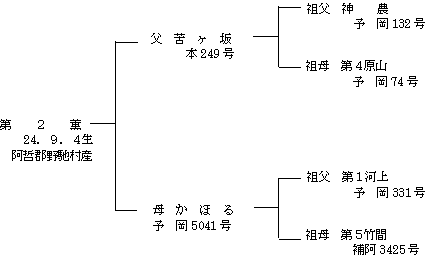 三.種付料金は600円(県の規定による。)次に第2薫号の血統は下の通りである。