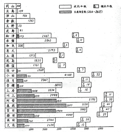 郡別 | 御津 | 小田 | 後月 | 吉備 | 上房 | 川上 | 阿哲 | 真庭 | 苫田 | 勝田 | 英田 | 久米 | 計 |