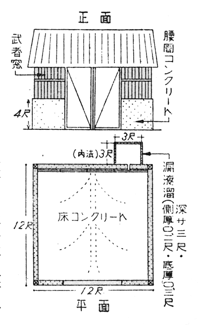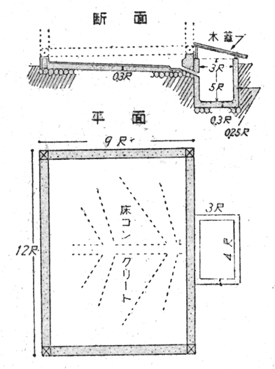 ロ.尿溜 大きさ内側縦4尺,横3尺,深さ5尺………牛馬1頭1日の尿の量は約2貫内外(4−5升)で之に舎内を清掃したりする時の洗水の流入を考えて約其の2倍1日1斗約5貫と見て4尺×3尺×5尺の尿溜を設ければ約10石程容るので,大体3ヶ月分は貯えられます。底厚3寸,側壁厚2.5寸,漏病を防ぐために内面にはモルタル5分厚に上塗する。