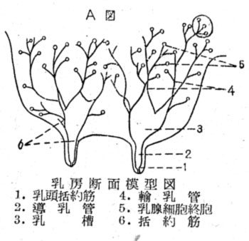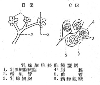 乳房の外部の構造は周知の通りであるから省略して,内部の構造について申述べる。乳房内には,乳腺組織,血管組織,淋巴組織,神経組織とがあって,それ等を支えるため結締組織と筋肉等より出来ていて甚だ複雑である。乳を造る乳腺組織を乳房従断面の模型図で示すとA図のようである。図や○印の乳腺細胞終胞を拡大するとB図となる。又B図の房胞の断面図はC図である。
