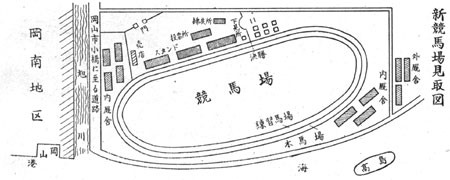 さて原尾島の岡山競馬は,昭和8年岡山県愛馬倶楽部により設置せられたもので,その後岡山馬匹組合がこれを経営してきたが同23年競馬法の画期的な改正に伴い,同組合は解散し,その儘県に引継がれ今日まで運営に当って来た。