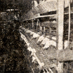 このほか腐植土・小砂・カキガラ・食塩少量を与える。これだけの飼料で目下の平均は6−7割の産卵を突破していると言う。産卵を開始してから1羽飼いの鶏舎に移す。そして夕方の点燈により3月−4月の間に換羽させる。