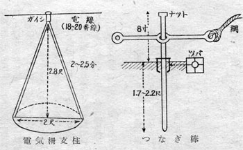 次に牛をつなぎ放牧する場合に用いる。つなぎ棒と移動電気柵について私の考案したものをお知らせする。つなぎ棒は自由に廻転するような次のようなものがよい。又電気柵の支柱として底部の円く凸面になった円錐形のものを利用すると,牛がふれても弾力性があって便利である。18番線から20番線を2段位に取りつけておくとよい。ガイシを取付けるため2−2.5分の板で巾はナットの入る位のものを支柱に取りつける。