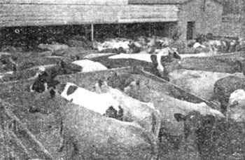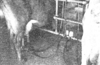 柵の中に入れられた牛は自分でミルカーの中に入って行く,すると待っていた人がそこから出られない様に後肢の後にくさりを掛け,それから水道で乳房を洗滌して,搾乳機を装着する。自分で独りで入っている牛に次々とこの様にして装着して行くのである。機械は自動的に動いて搾乳を行い。搾った乳はパイプを通って次の処理室の方へ流れて行く。搾乳が終れば牛の前の扉を開いてやると牛は自分で前の方へ柵の中へ出て行く,すると後で待っている次の牛がちゃんと独りでミルカーの中へ入って来るので,見ていても面白い,これならば何頭居ても2-3人でもやれるわけである。処理室に送られた乳は,パイプを通ってクーラーの上に来て,濾過機を通り,クーラーを通って自然に冷却され,更にその下の分離機を通ってクリームと脱脂乳に分けられ,クリームは輸送鑵に入れられ,脱脂乳はパイプでタンクに送られ,これは豚の飼料や哺乳用に使われる。輸送鑵の方には笛がつけてあり,一杯になると笛がなったものはすぐ次の鑵と取り換えられ,冷風式冷蔵庫の中に貯蔵される。市乳の場合はクーラーからすぐ輸送鑵に入られる。搾乳が終れば1箇所に集まっている牛を又犬が放牧場へ追って行って放牧するのである。人手は先程も書いた様に搾乳する処に2人,処理室に1人,計3人位でやっており,搾乳時間は大体80頭位で1時間半位である。