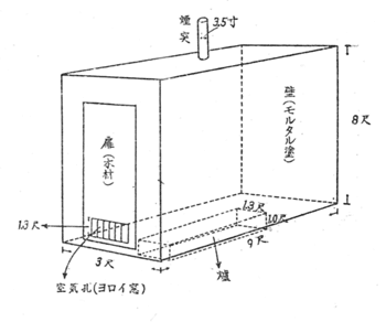 第3に燻煙室の構造に就ては,製造規模によって大,小様々なものがあり構造も異なって参りますが,考え方としてはセメント・レンガ・其の他の不燃性の材料によって床,周囲の壁,天井を築き,一方の壁に出入口を設け,それには下部に調節の出来る空気出入口を開けた戸をはめ,底部の床には炭火を起し,燻煙材を燻し得るような深さ1尺,巾1尺,長さ適度(部屋の大きさによって異る)の炉を築き,又天井の中央には直径3~4寸の開閉弁の付いた煙突を装置すれば事足ります。要は煙りは洩れない事と,室内の温度が或程度調節出来るようになっておれば結構です。燻煙室の巾,奥行は2~3尺程度のものでもよろしいが高さだけは,6,7尺,少くとも炭火と吊り下げた燻肉材料との距離が4尺位はないと温度の調節が困難のように思われます。当場の燻煙室を示しますとA図のとおりです。又農家等で簡単に行う場合はB図のようなものを工夫して行えばよろしい。但しこの場合は温度が上下変動し易いから注意しなければなりません。