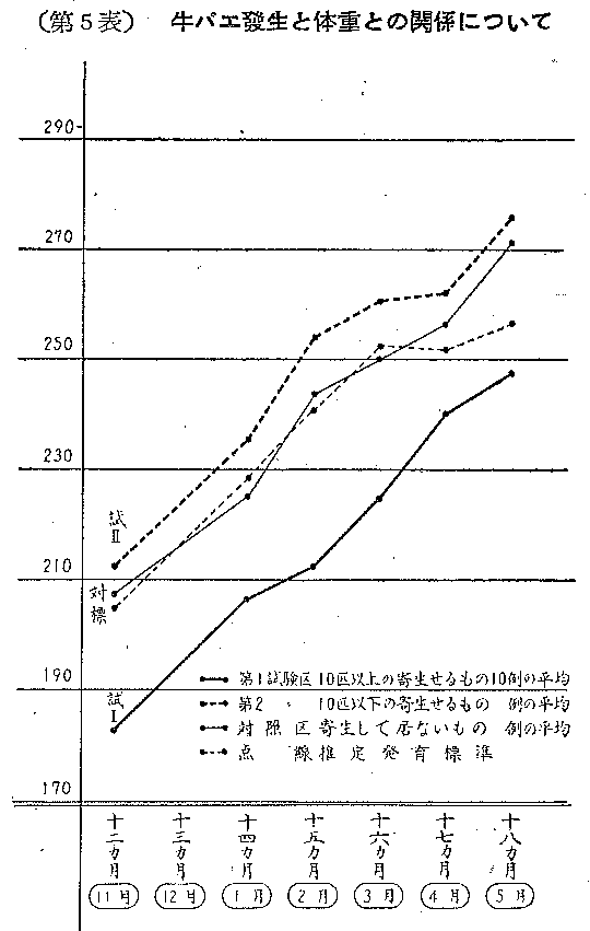 第五の牛バエ幼虫の体栄養の影響については,導入直後の調査でありまして輸送による栄養の低下が快復しない時から調査を始めましたので,明確な結果が得られなかったのでありますが,体重は軽く栄養も悪い牛に多発して居たのは,導入前に於いて本虫のために栄養を阻害されたのか,栄養の悪い牛に好んで寄生したのかどちらかであろうと思います。寄生数と増体重との間に相関がなく,幼虫摘出前後に増体重に差がないことはこれを裏書して居ります。又体高,体型から推して年命に余り差はないと思われるのですが,平均年命が出ないために発育標準と対比する事が出来なかった。又乳量の影響については他に対比する対照がなかったので其結論は出し得なかったのでありますが,要するに,例数僅少の上導入直後の牛であり年令も不明であったので正確な結論に達しなかったのでありますが,当地では成虫の発生も困難で本虫のため直接の悪影響はなく背腰部に幼虫が現出する時は盛んに舐めて落付きがなく治癒後の現在に於いても放牧中虻サシバエの襲撃に対し非常に神経質で放牧が困難であるのは本寄生虫を惧れるためであろうと思われます。