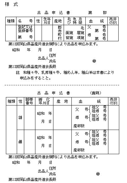 第6条 この会に出品しようとするものは,別紙様式の出品申込書に登録証明書,その他血統を証明する書類の写を添えて昭和31年9月15日までにこの会の事務所に提出しなければならない。